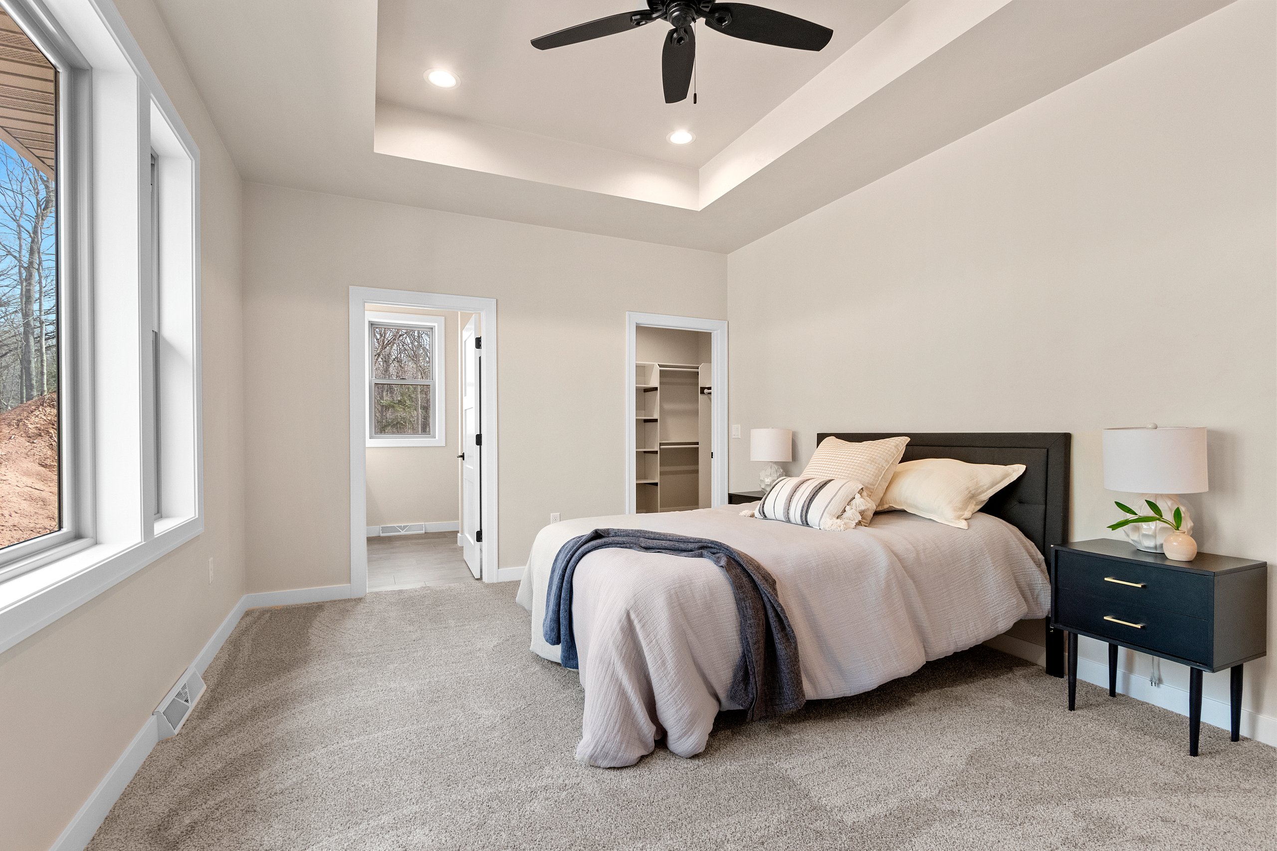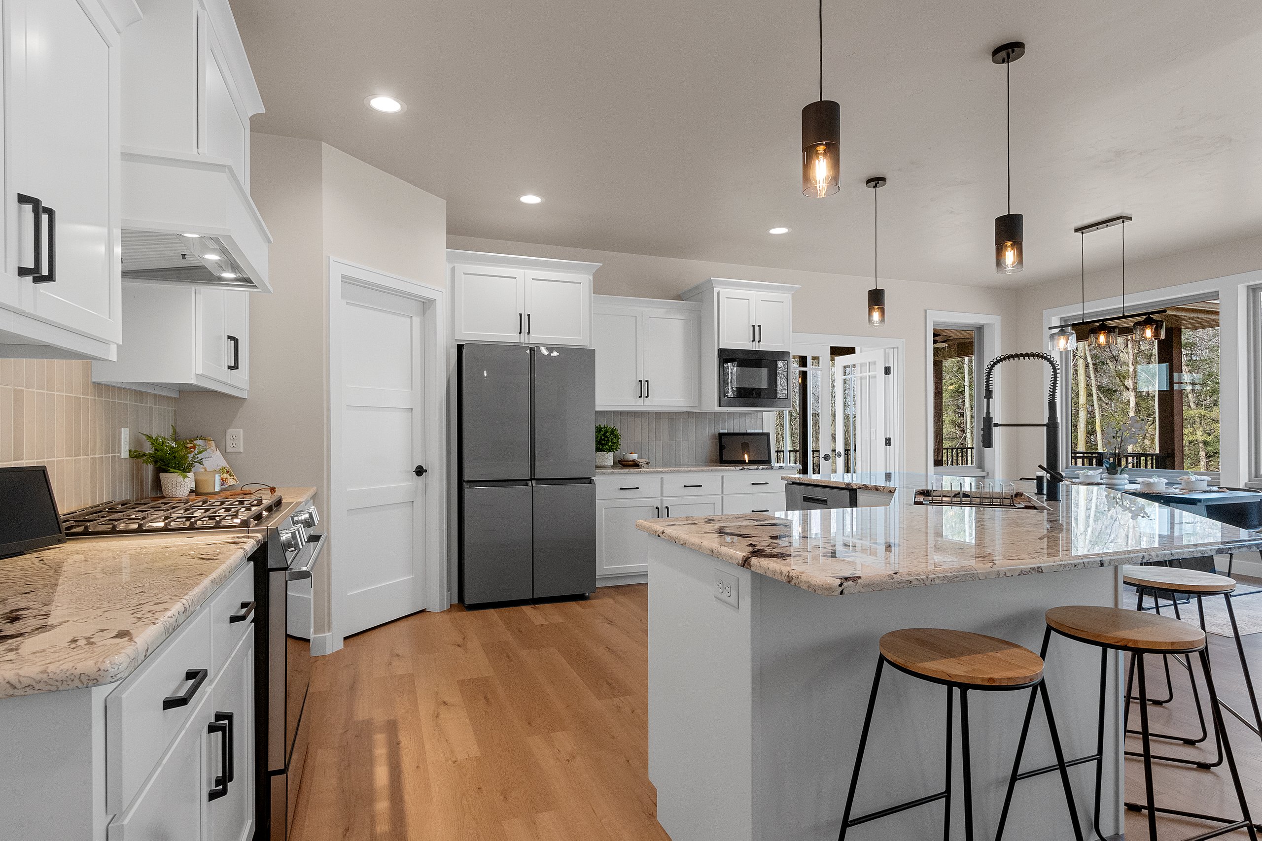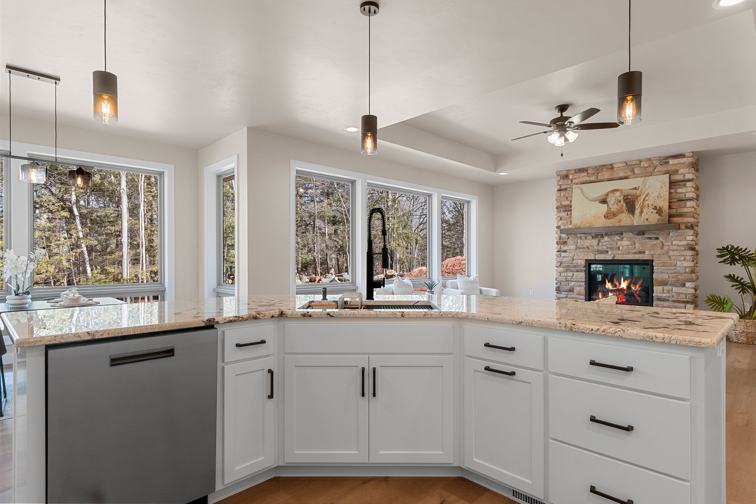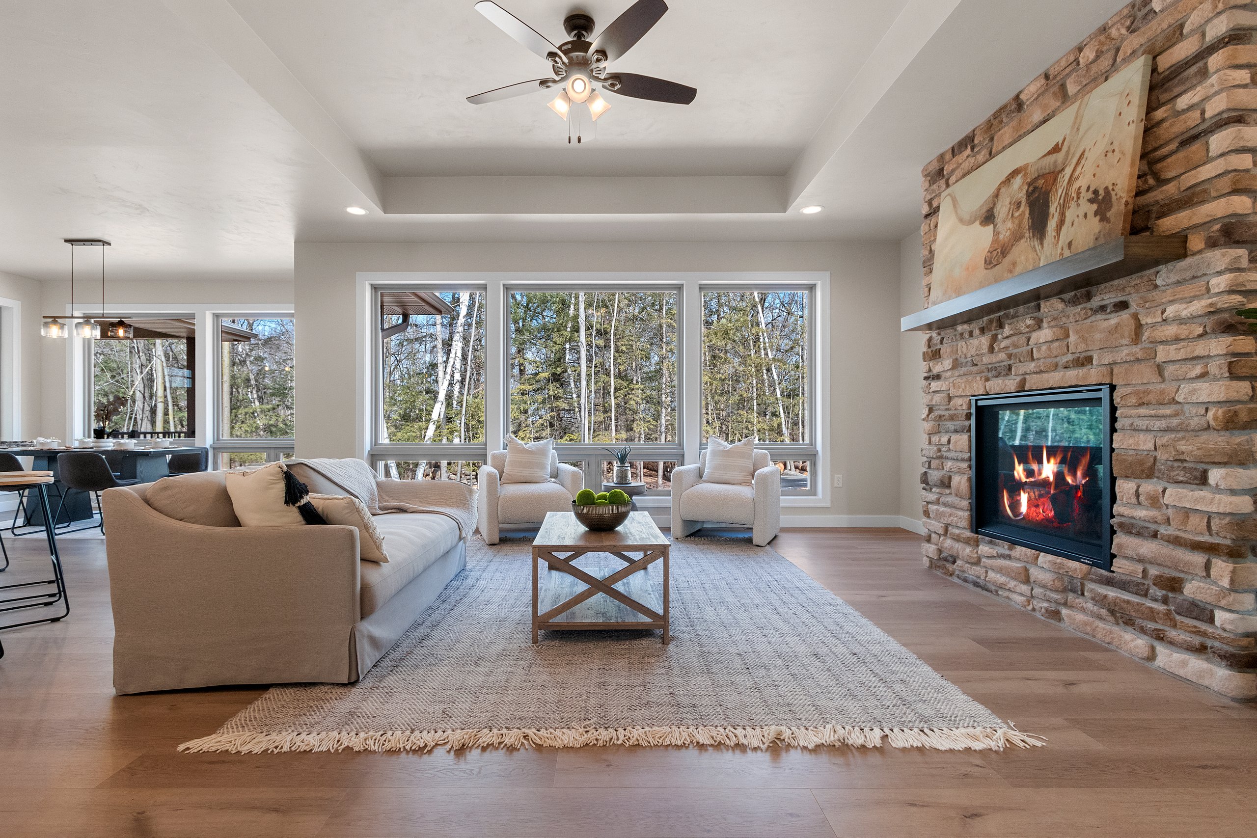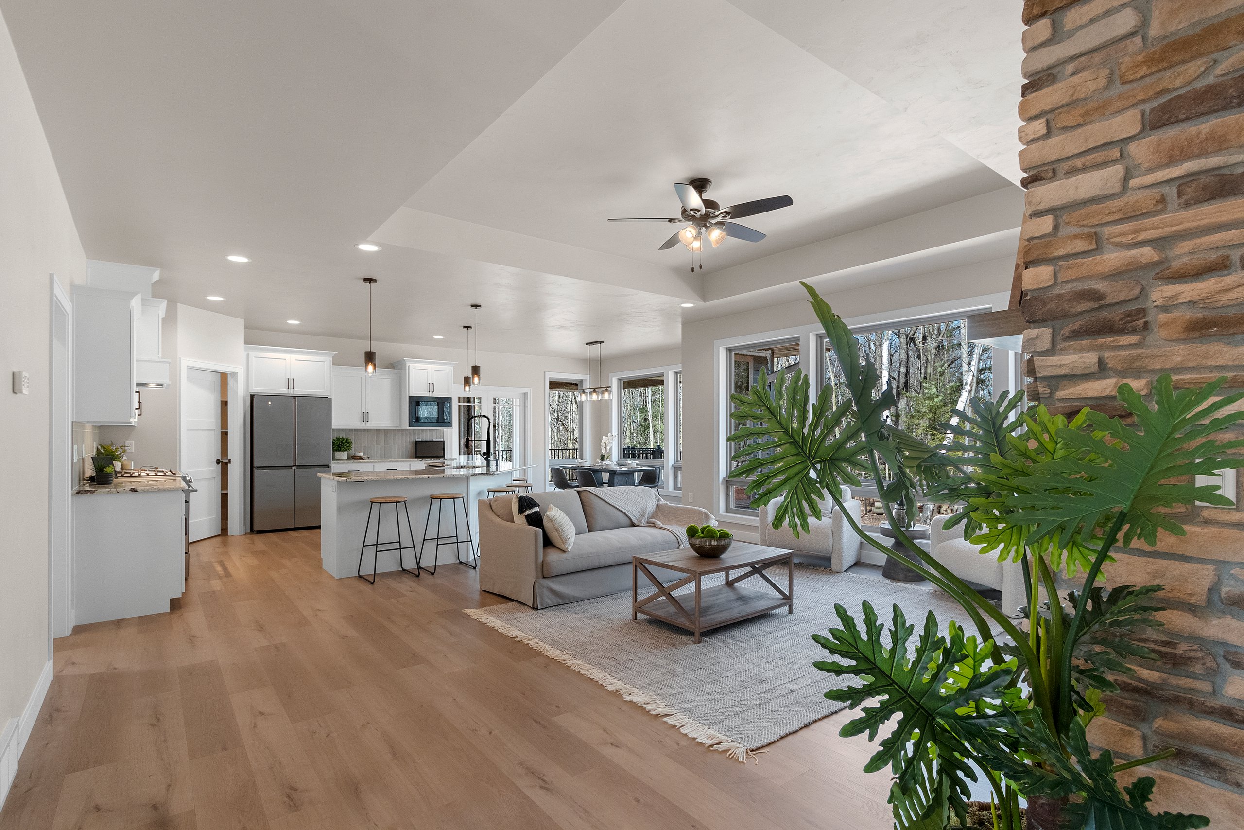 This beautiful home features a three-stall garage with striking exterior stone accents. Inside, you’ll find three bedrooms and two and a half bathrooms. A spacious deck offers the perfect place to enjoy the warmer months, while the sunroom provides a cozy retreat when the weather turns cold. The kitchen boasts a unique boomerang island that overlooks the living room—an ideal setup for entertaining. The living room also features multiple large pictures windows that overlook a majestic ravine in the backyard. Tray ceilings in both the living room and the primary bedroom add an elegant finishing touch